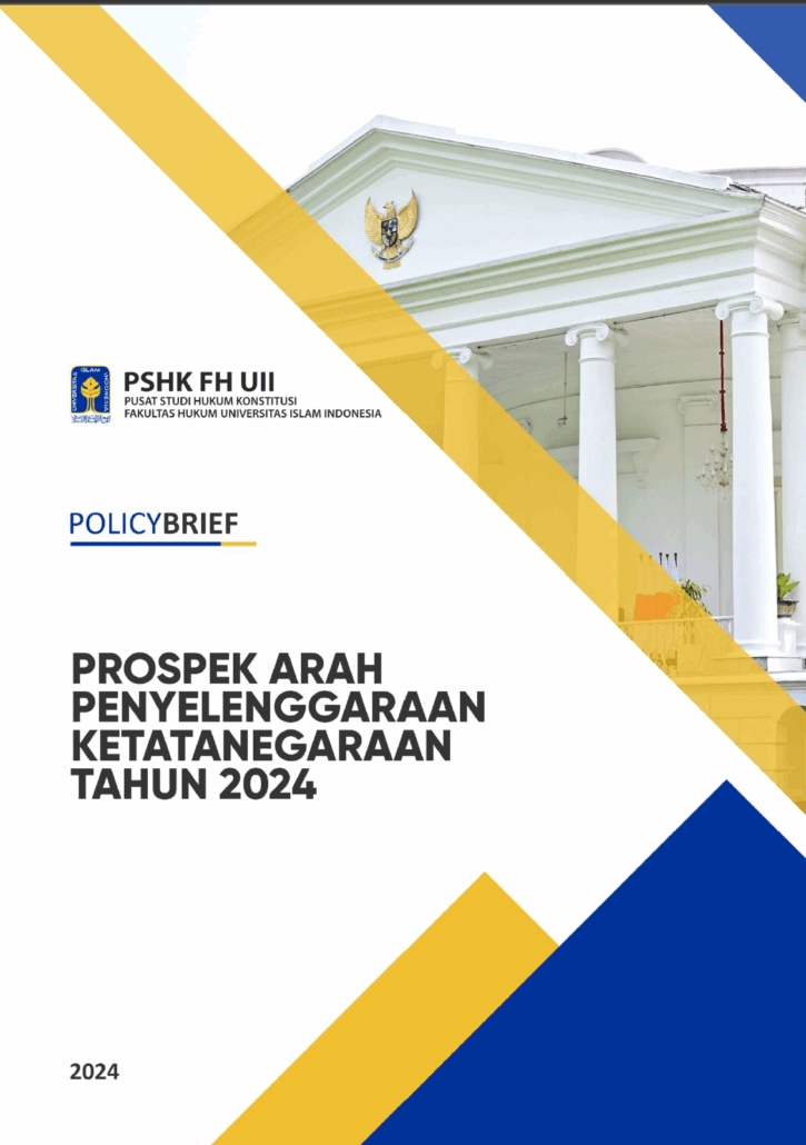 Pusat Studi Hukum Konstitusi (PSHK) Fakultas Hukum (FH) Universitas Islam Indonesia (UII) kembali menerbitkan Policy Brief pada tahun 2024 ini. Kali ini, PSHK FH UII menyoroti tentang “Prospek Arah Penyelenggaraan Ketatanegaraan Tahun 2024”. Kertas kebijakan ini akan memfokuskan kajian terhadap 3 (tiga) penyelenggaraan ketatanegaraan yang akan dihadapi oleh Negara selama 1 (satu) tahun ke depan atau pada tahun 2024 ini, yakni: